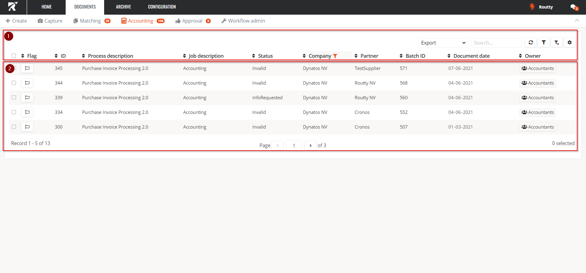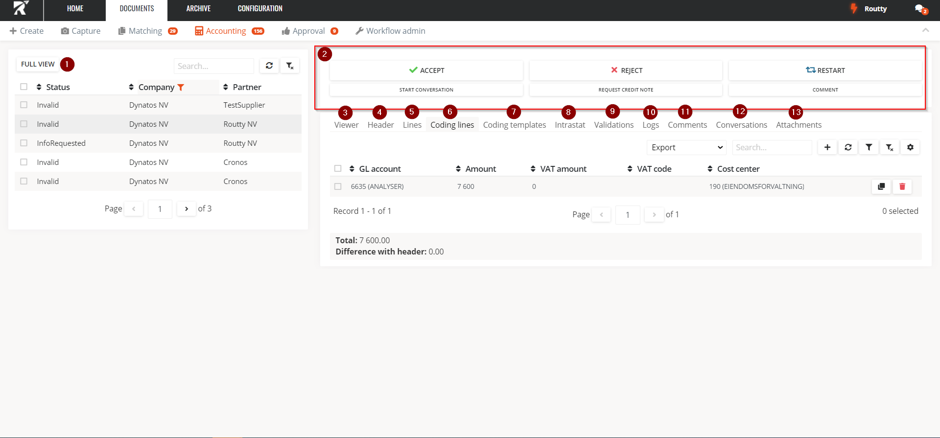 Overview area of all documents in the ‘Accounting’ step that are assigned to you for further processing. When a document is clicked, the editing area for this document opens.