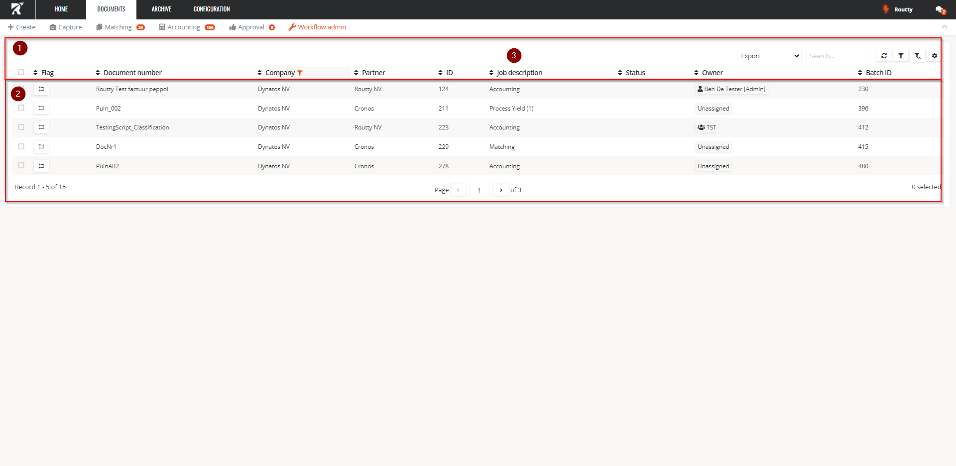 The workflow admin page shows an overview of all documents in all steps of the workflow and for all statuses and assignees for the Routty Accounts Payable flow. This page is to be used a monitoring page to make sure all documents in the flow are following business rules.