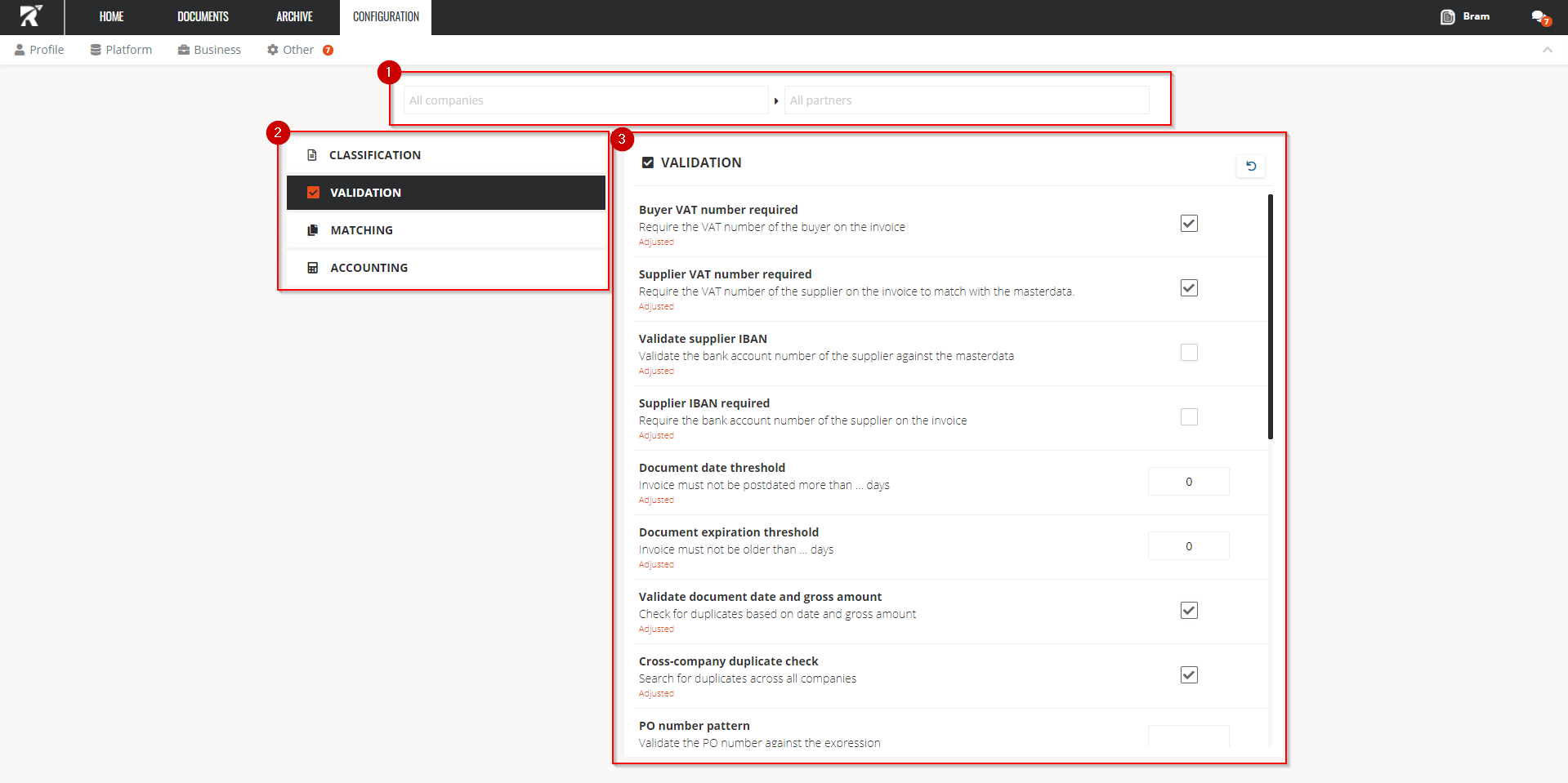 The workflow settings can be used to configure your business process to your needs using a set of configuration options. Each option can be configured for the entire platform, for a specific company or for a combination of company and partner. Using these settings it is possible to direct how documents and invoices are handled in the Routty platform. Depending on the configuration of your system not all of these workflow settings are applicable.