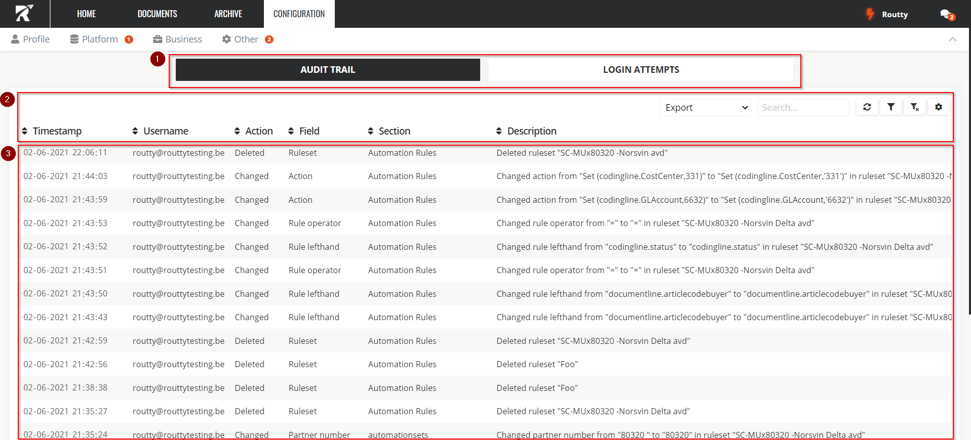 AUDIT TRAIL Shows all the actions a user made after logging in to Routty
