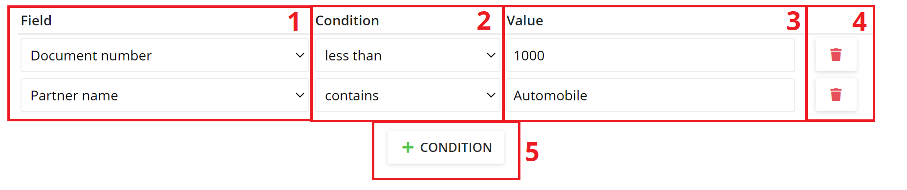 Finally, you can delete conditions using the delete icon (4), and add new ones using the add button (5).