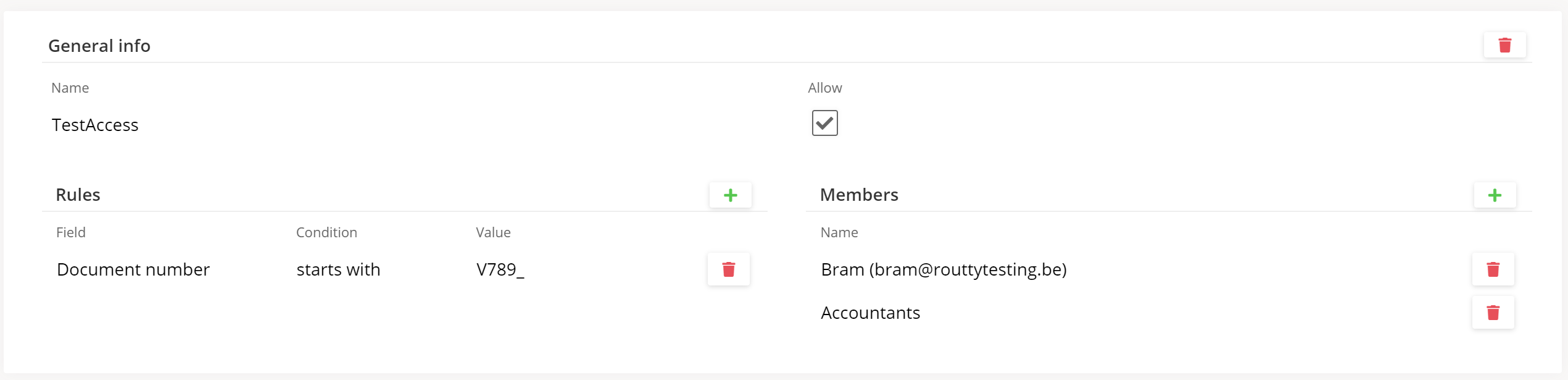 An access right, configured so that the user Bram and the group Accountants are able to see all the documents wherefore the document number starts with ‘V789_’xxxxx.