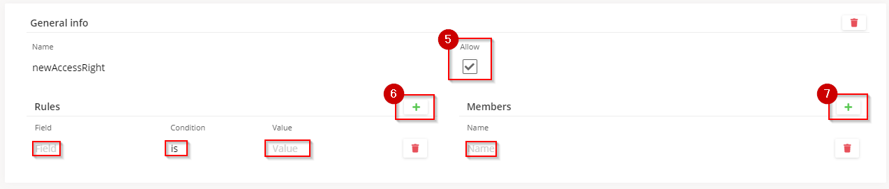 A new ‘create access right' modal pops up: Enter a name for this new access right entry and click on save (a name with characters and spaces only, no special characters allowed)