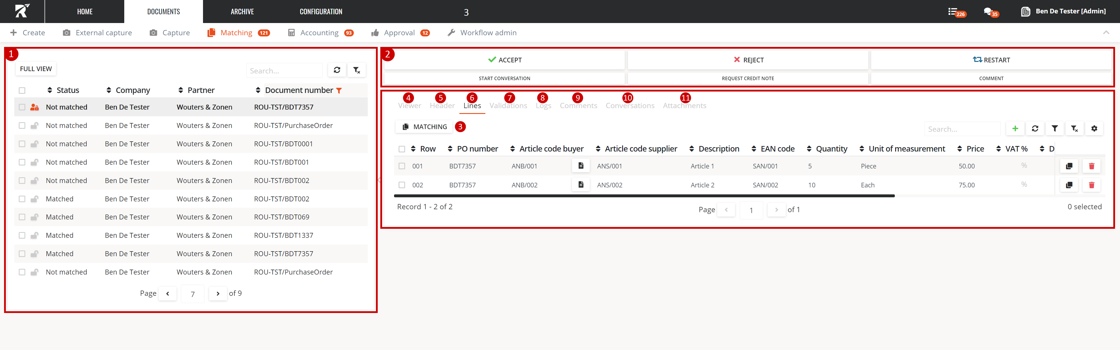 2. Overview area of all documents in the ‘Matching’ step that are assigned to you for further processing. When a document is clicked, the editing area for this document opens.