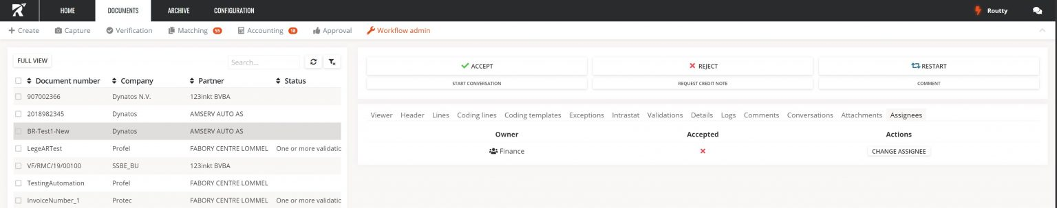 An assignee of a document (either a user or a group) can be changed on active documents. This will result in another user taking over the responsibility of handling this document.