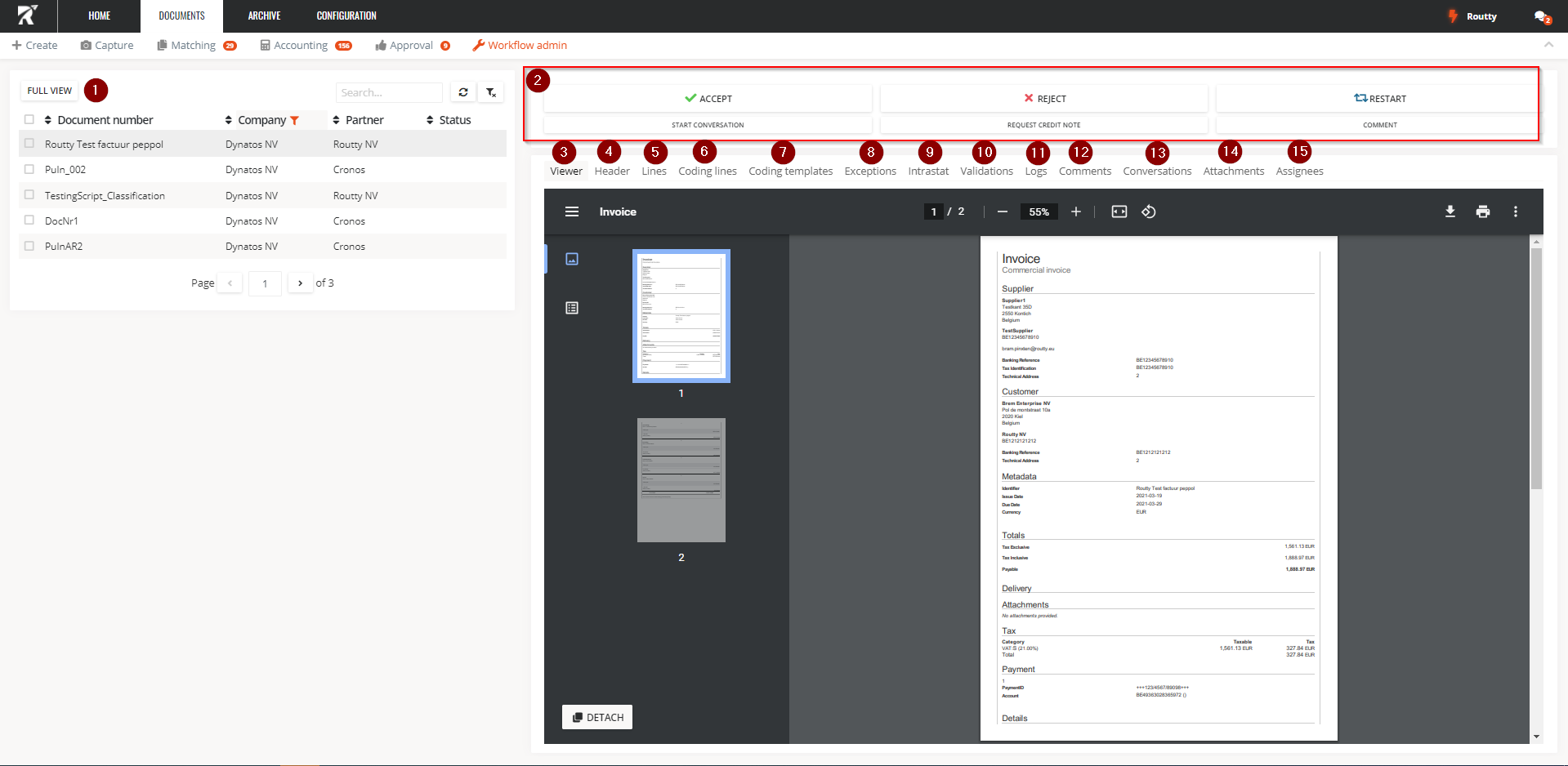 A number of actions can be taken on each document, these may differ based on the business process that has been set up for your Routty installation. In general, the following actions will occur: