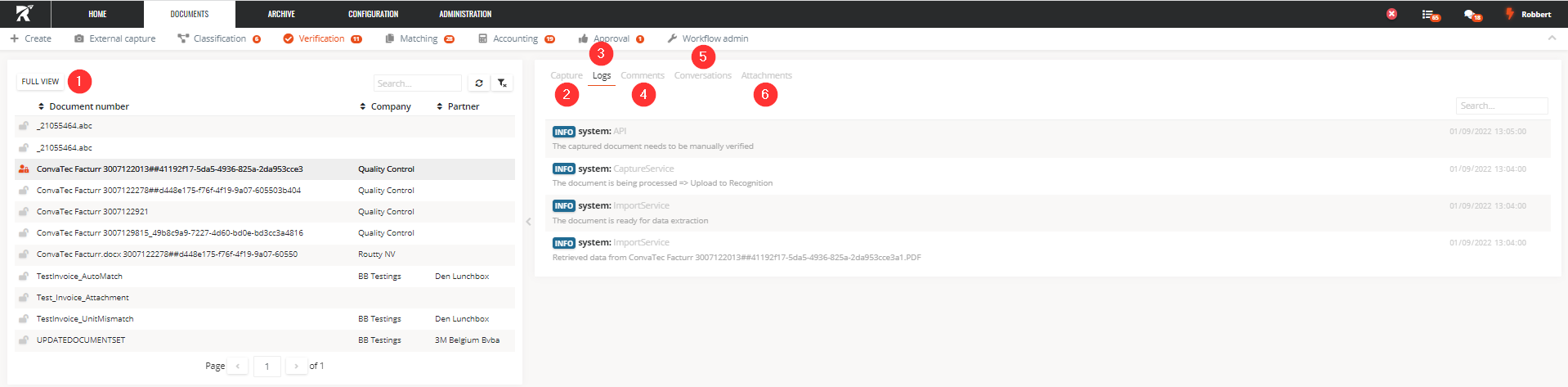 Overview area of all documents in the ‘Verify’ step that are assigned to you for further verification.
