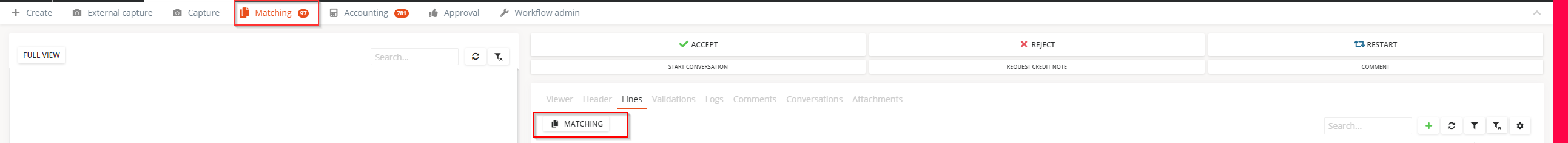 Navigate to the LINES tab in the matching screen (part of the Documents screens) and click on the ‘matching' button
