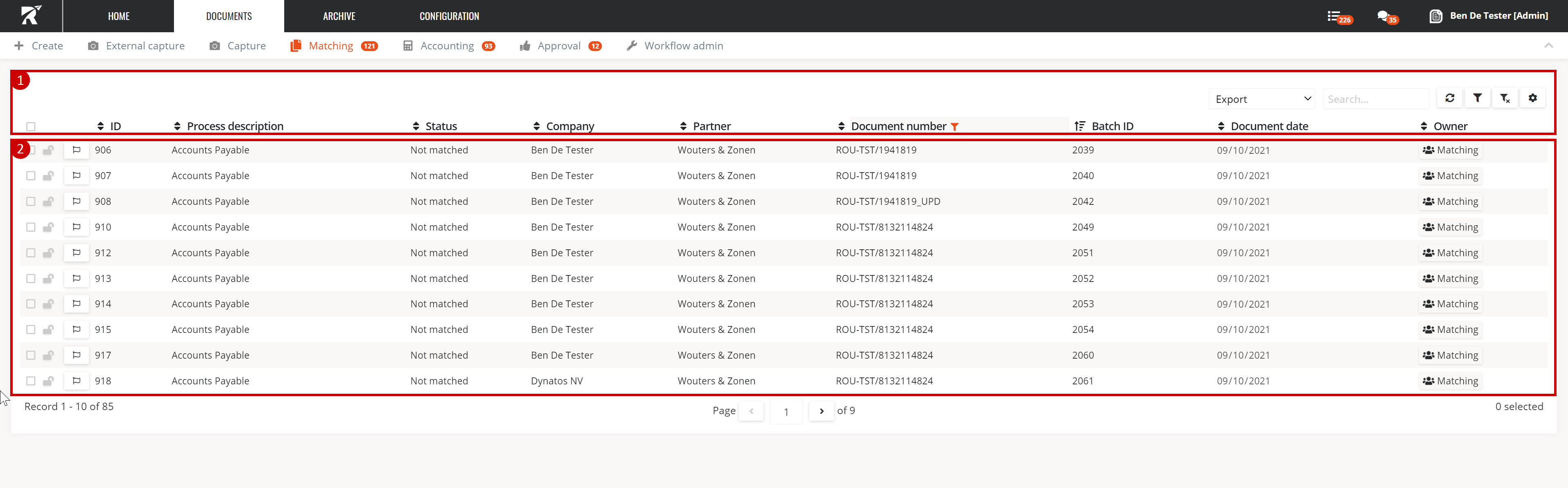 Overview area of all documents in the ‘Matching’ step that are assigned to you for further processing. When a document is clicked, the editing area for this document opens.