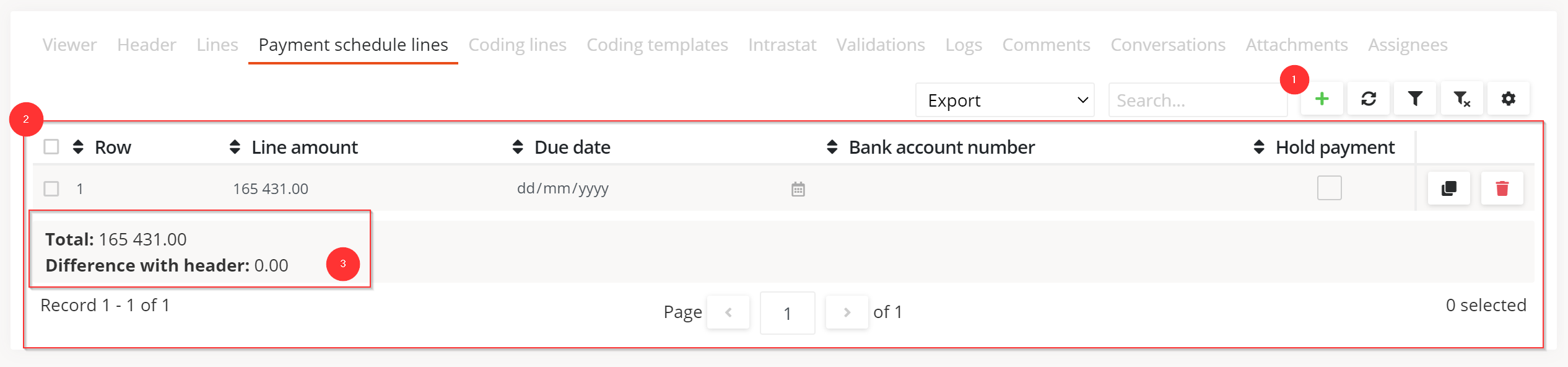 Sum of all payment schedule lines and the difference (if there is one) with the amount that’s present on the header.