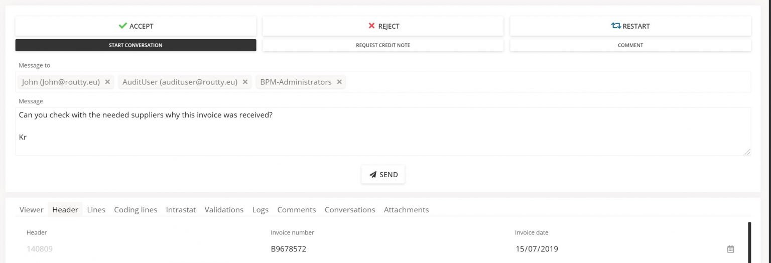 4. Enter a message and press the SEND button, a conversation will be created on the specific document with the selected users or/and groups